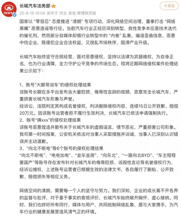 经诉讼,法院判定其构成名誉侵权,判决删除侵权内容、连续15日公开致歉、赔偿20万元。因该账号运营者拒不履行生效判决,长城汽车已依法申请强制执行。